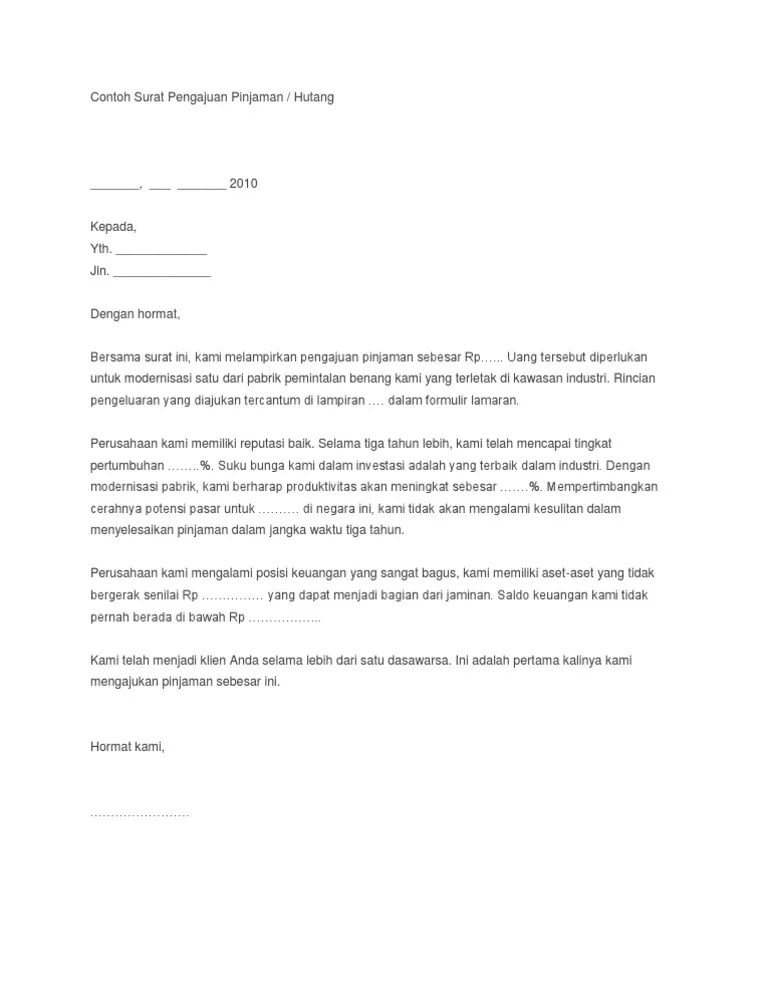 Format surat permohonan pinjaman pemulihan ekonomi. Demikian proposal kelayakan usaha ini dibuat dengan benar, . Format proposal permohonan pinjaman kepada lpdb . Cara membuat surat permohonan pinjaman uang pada perusahaan jili surat peminjaman edit salah satu kebijakan perusahaan adalah memberikan . Download contoh surat pinjaman uang kepada perseorangan.